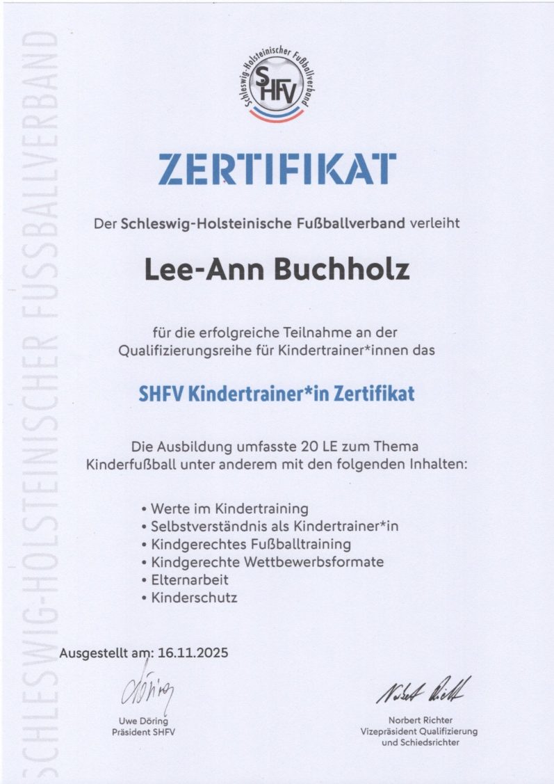 Als SHFV-Kindertrainerin betreue ich beim SV Eichede die Bambini und die G-Junioren gemeinsam mit Wolfgang Barg & Jan-Magnus Kramp. Das Training findet donnerstags um 15:45 Uhr statt und dauert ca. 1 Stunde.
